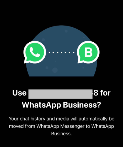 Vaihe 3:Jos käytät jo Whatsappia iPhonessa, sinua pyydetään käyttämään samaa numeroa WhatsApp -liiketoimintaan. ValitaKäytä eri numeroasen sijaan.
