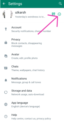Voit vaihtaa edestakaisin kahden tilin välillä nuolikuvaketta nimesi vieressä. Sen sijaan, että kirjaudut sisään puhelinnumeroosi, voit myös linkittää puhelimesi toissijaiseen WhatsApp -tiliisi QR -koodilla.