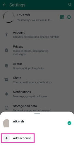Siirry sovelluksen WhatsApp -asetuksiin ja paina alaspäin nuoli nimesi vieressä. Valitse 'Lisää tili'. Sinun on suoritettava toisen tilin asettamisprosessi kirjautumalla sisään rekisteröidyn puhelinnumeron avulla. Voit käyttää puhelinta myös toiseen WhatsApp -tilillesi.