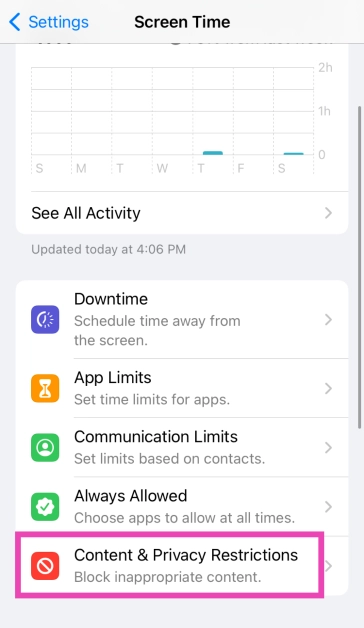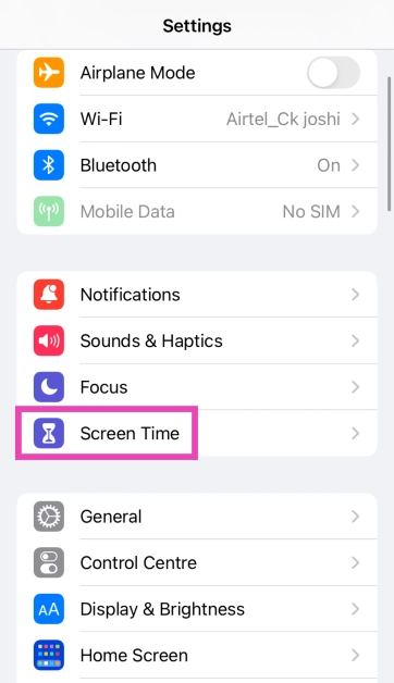Vaihe 1:Mennä jhkAsetuksetja valitseNäytön aika.