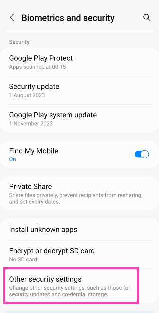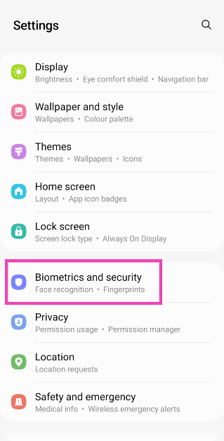 Vaihe 1:Mennä jhkAsetuksetja valitseBiometriset tiedot ja turvallisuus.