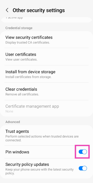 Mennä jhkAsetukset> Biometriset tiedot ja suojaus> muut suojausasetuksetja kytke kytkin päälle PIN -Windows -kytkin. Siirry nyt sovelluskytkimeen ja napauta sovelluksen kuvaketta, jonka haluat kiinnittää. Valitse luettelosta 'Pin tämä sovellus'.
