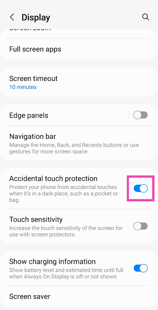 Mennä jhkAsetukset> Näyttöja sammuta vaihtokytkin 'vahingossa tapahtuvan kosketussuojan' vieressä.