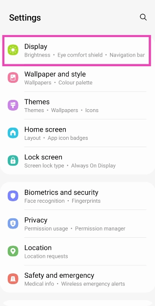 Vaihe 1:Mennä jhkAsetuksetja valitseNäyttö.