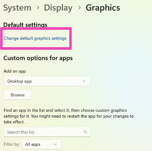 Mennä jhkAsetukset> Järjestelmä> Näyttö> Grafiikka, napsauta 'Vaihda oletusgrafiikka-asetuksia' ja kytke kytkentäkytkin päälle 'Laitteiden kiinnittämän GPU-aikataulun' vieressä.