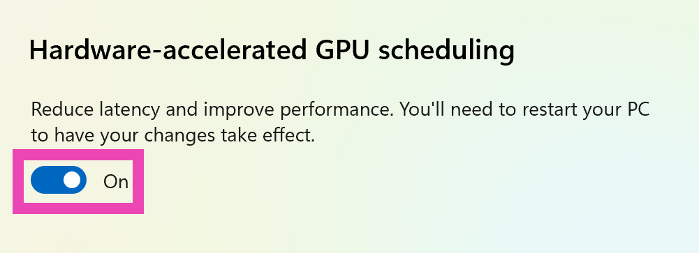 Vaihe 5:Kytke kytkentäkytkin päälleLaitteistoa kiihtynyt GPU-aikatauluLaitteiden kiihtyvyyden kytkeminen käyttöön. Selaa se takaisin sammuttaaksesi sen.