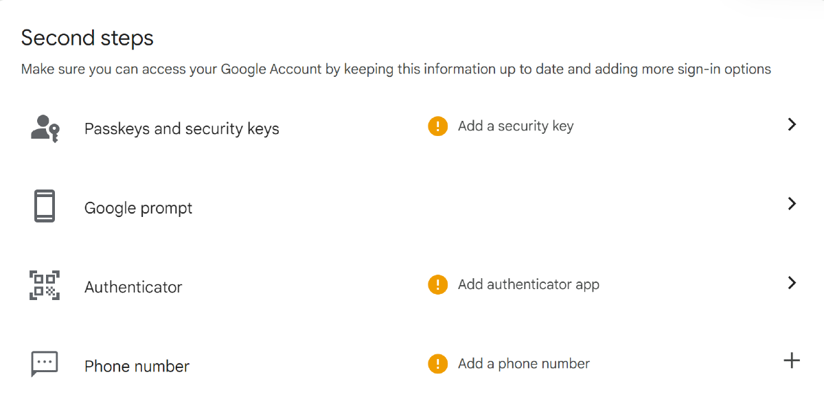 Vaihe 5:Valitse miten haluatvahvistaaKirjautumisyrityksesi. Google antaa sinulle seuraavat vaihtoehdot - passkeys ja tietoturva -avaimet, Google -kehote ensisijaisessa laitteessa, todennussovellukset ja puhelinnumero.