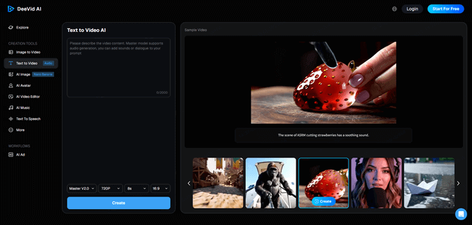 DeeVid AI on suunniteltu luomaan todentuntuisia tekoälyvideoita, mukaan lukien suudelmakohtaukset. Sen intuitiivisen editorin avulla käyttäjät voivat luoda videoita nopeasti ilman edistyneitä muokkaustaitoja.