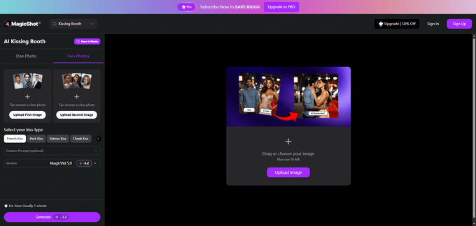 MagicShot AI on suunniteltu romanttisten ja hauskojen tekoälyvideoiden luomiseen. Se tukee tekoälyn luomia suudelmakohtauksia realistisilla ilmeillä.