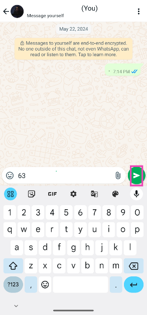 Vaihe 1:KäynnistääWhatsApp ja valitsekeskustelun lankanumerosi kanssa. Siihen liitetään '(Sinä)'.