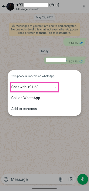 Voit lähettää WhatsApp-viestin tallentamattomaan numeroon napauttamalla sitä sovelluksessa ja valitsemalla Chat with…. Jos et löydä numeroa mistään WhatsAppista, lähetä se itsellesi ja valitse se.