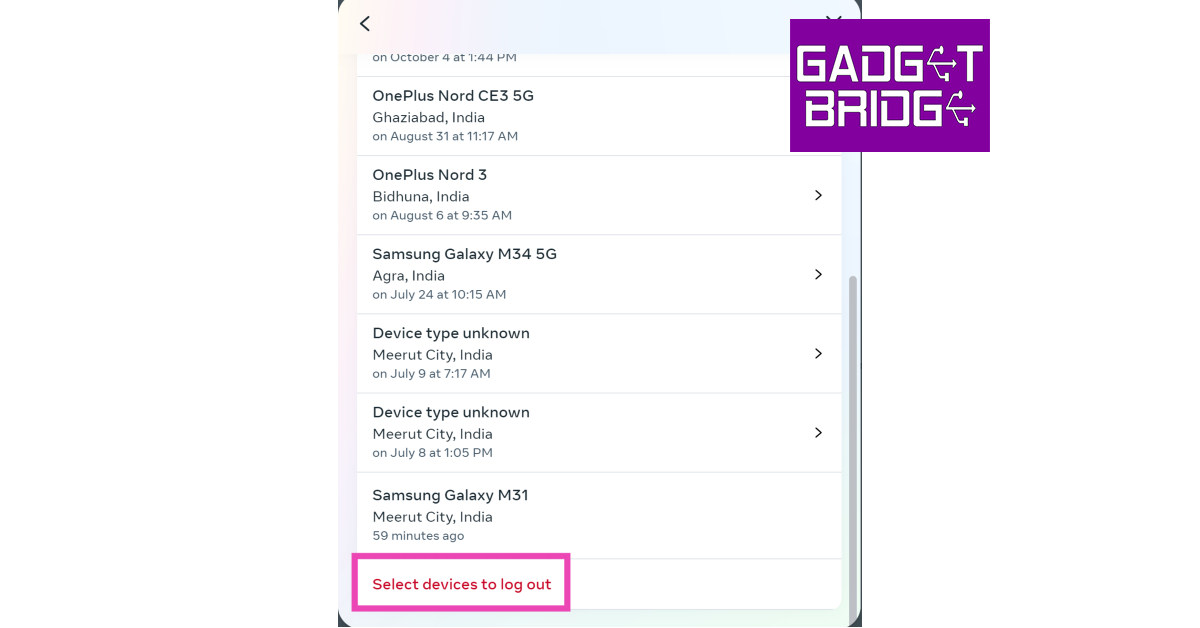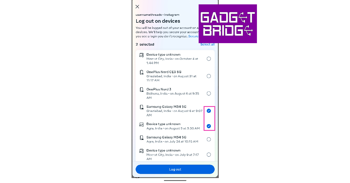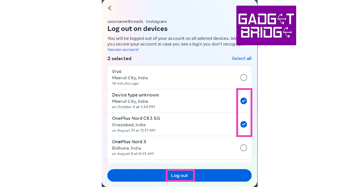 Jos joku muu on saanut luvattoman pääsyn Instagram -tiliisi, heidän laitteensa näkyy tiliisi kytkettyjen laitteiden luettelossa. Mennä jhkInstagram> Profiili> Valikko> Asetukset ja tietosuoja> AccoutS Center> Salasanat ja suojaus> missä olet kirjautunut sisäänSelvitä, mitkä laitteet on kytketty Instagram -tiliisi. Jos et tunnista tiettyä laitetta, se voi kuulua jollekin, joka on jotenkin päässyt tilillesi. Voit poistaa tämän laitteen napauttamallaValitse laitteet kirjautumaan ulos.