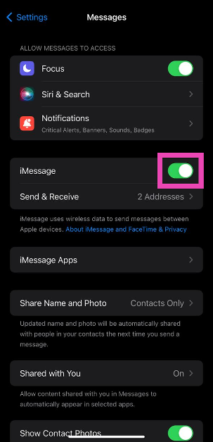 Mennä jhkAsetukset> Viestitja sammuta vaihtokytkin IMESSAGE: n vieressä poistaaksesi sen käytöstä.