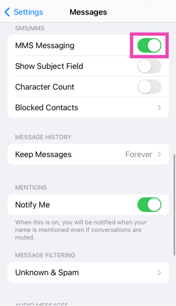 Vaihe 2:Vieritä alas ja sammuta vaihtokytkinMMS -viestintä. Odota muutama sekunti ja kytke se sitten takaisin.
