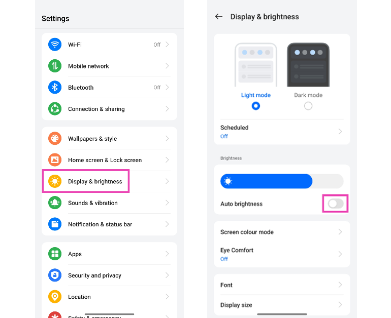 Android -älypuhelimilla on kätevä 'mukautuva kirkkaus' -ominaisuus, joka säätää näytön kirkkaustason automaattisesti ympäröivän valon mukaan. Jos olet ulkoympäristössä suoran auringonvalon alla, näyttö työntää sen kirkkauden automaattisesti enimmäistasolle, jotta se olisi luettavissa. Samoin yöllä kirkkaustaso laskee niin, että se ei ole ankaraa silmissä. Joskus tämä funktio voi toimia toimintahäiriöitä ja ei pysty määrittämään oikein ympäröivän valon voimakkuutta. Tässä tapauksessa puhelimesi näyttö saattaa alkaa välähtää. Mennä jhkAsetukset> Näyttöja sammuta vaihtokytkin 'automaattisen kirkkauden' vieressä.