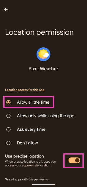Mennä jhkAsetukset> Sovellukset> Sää> Käyttöoikeudet> Sijaintija valitse 'Salli koko ajan'.