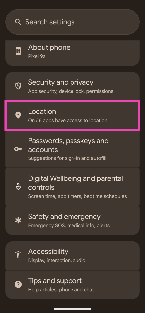 Vaihe 1:Mennä jhkAsetuksetja valitseSijainti.