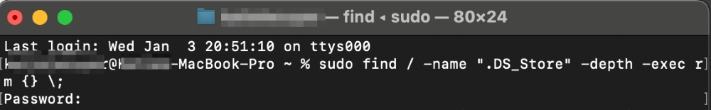 Sudo find / -name “.DS_Store” -depth -exec rm {} ; Tämä poistaa kaikki tiedostot. Sinua pyydetään syöttämään salasanasi, antamaan se (tietä, että se ei näytä mitään päätenäytölläsi) ja paina Enter.
