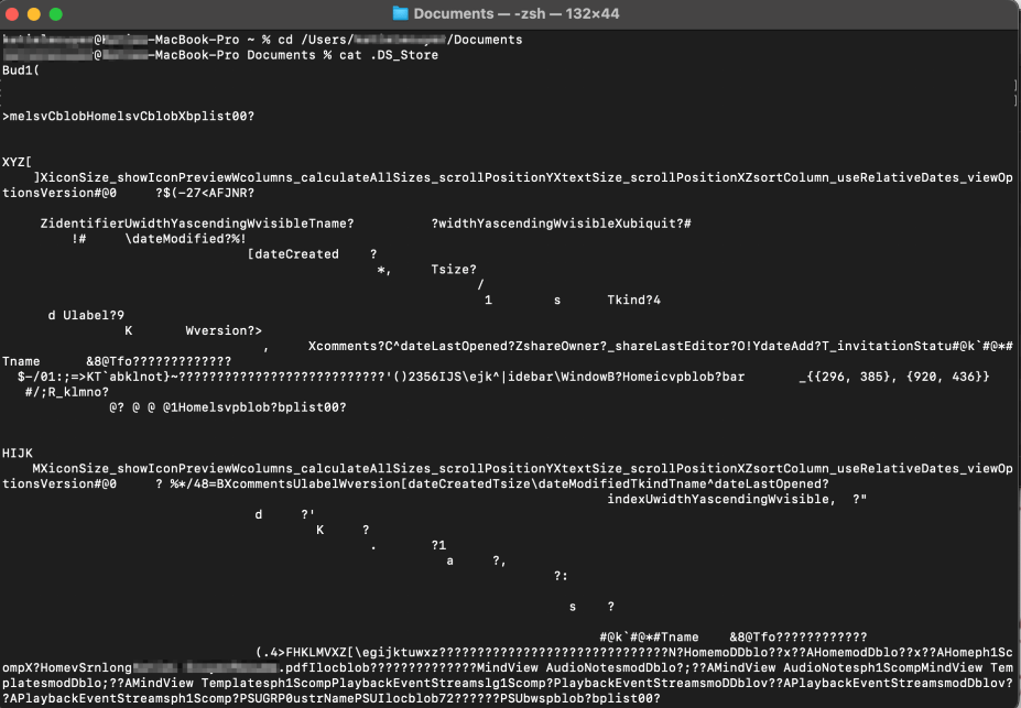Valitettavasti .DS_Store-tiedostoja ei voida nähdä käyttämällä tyypillisiä "näytä tiedostot" -päätekomentoja tai näppäimistön painalluksia (tämä muutos tehtiin macOS Mojavella).Jos kuitenkin haluat nähdä tiedoston sisällön, voit tarkastella sitä Terminalissa.Se näyttää suunnilleen tältä: