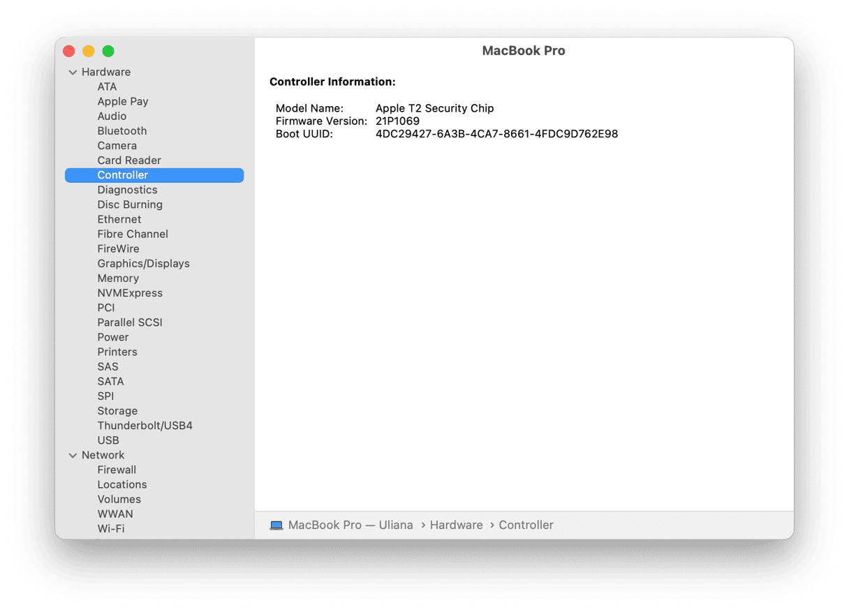 - Valitse System Report> Ohjain. Etsi viittaus T2 -tietoturvaan.