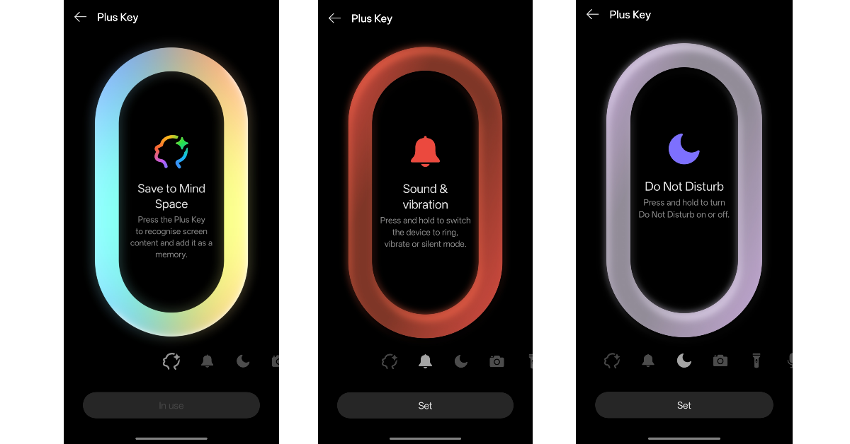 Oletuksena plus -avain on ohjelmoitu lukemaan näytön sisältö ja tallentamaan se muistina mielessä. Sitä voidaan räätälöidä ääniprofiilin vaihtamiseksi, avata kamera, ottaa käyttöön DND ja paljon muuta.