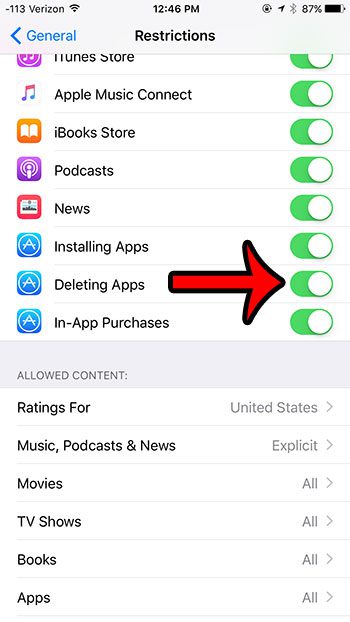 Jos yrität poistaa muuta kuin kyseisen luettelon sovelluksen, mutta et pysty, olet saattanut ottaa käyttöön asetuksen rajoitusvalikossa, joka estää sovelluksen poistamisen. Tämä vaihtoehto löytyy navigoimalla: