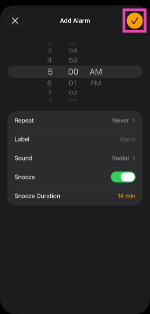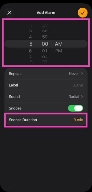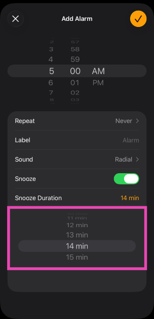 Käynnistä Kello-sovellus iPhonessasi ja siirry Hälytys-välilehdelle. Valitse olemassa oleva hälytys tai luo uusi. Napauta Torkku ja aseta uusi kesto liukusäätimellä. Paina rastikuvaketta, kun olet valmis.